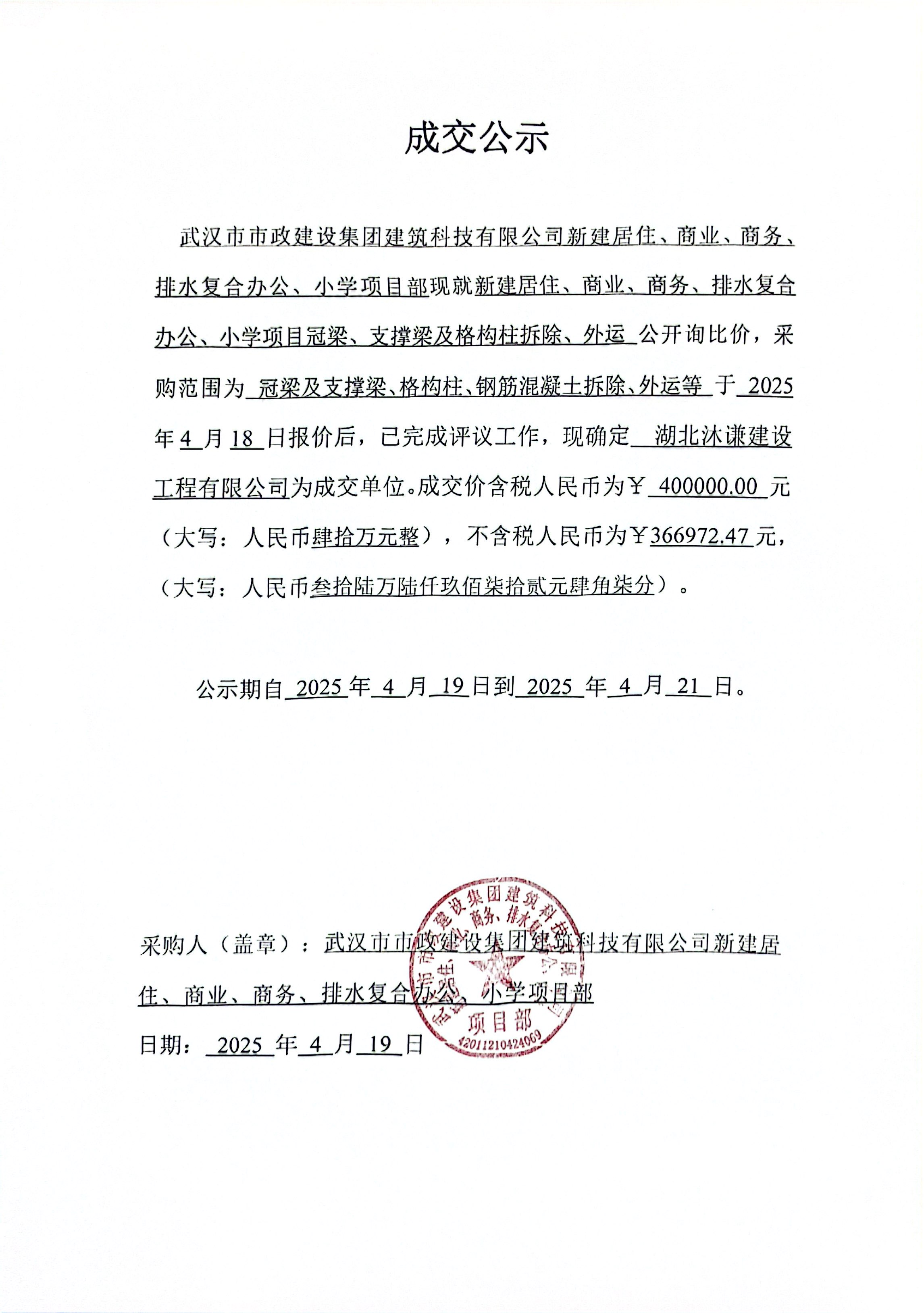 武漢市市政建設(shè)集團建筑科技有限公司新建居住、商業(yè)、商務(wù)、排水復(fù)合辦公、小學(xué)項目冠梁、支撐梁及格構(gòu)柱拆除、外運成交公示