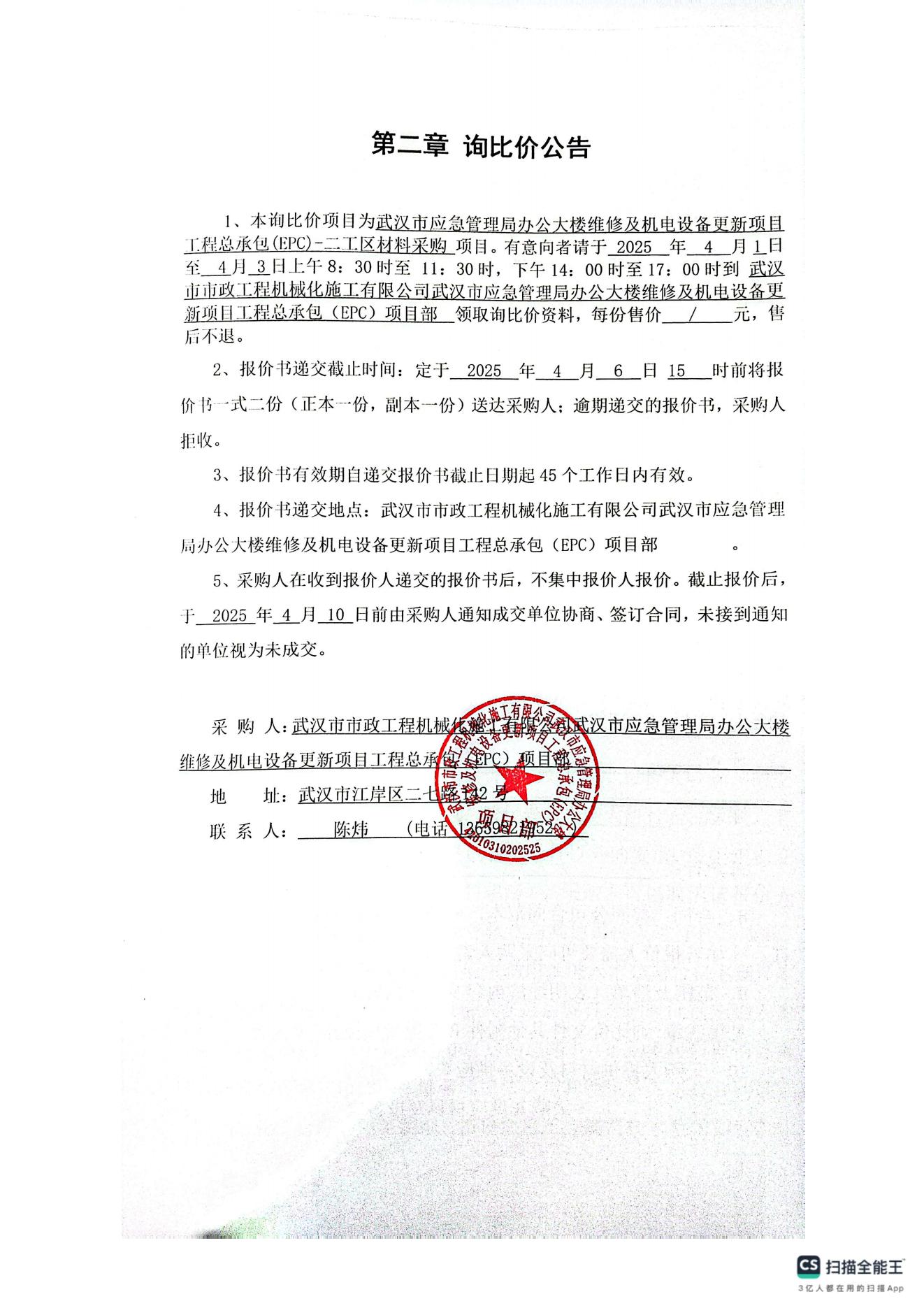 武漢市應急管理局辦公大樓維修及機電設備更新項目工程總承包(EPC)-二工區(qū)材料采購詢價公告