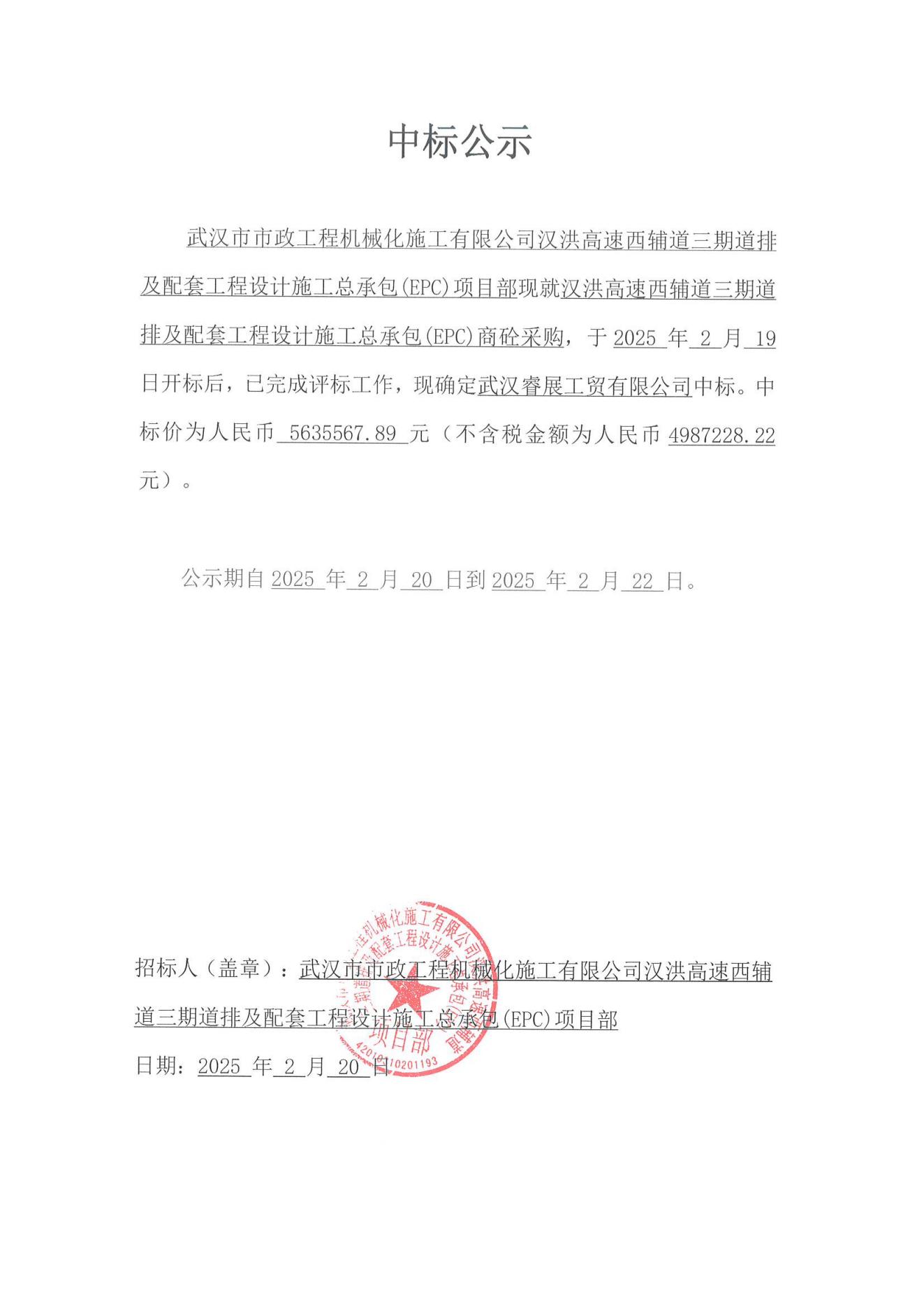 漢洪高速西輔道三期道排及配套工程設(shè)計施工總承包(EPC)商砼采購中標(biāo)公示