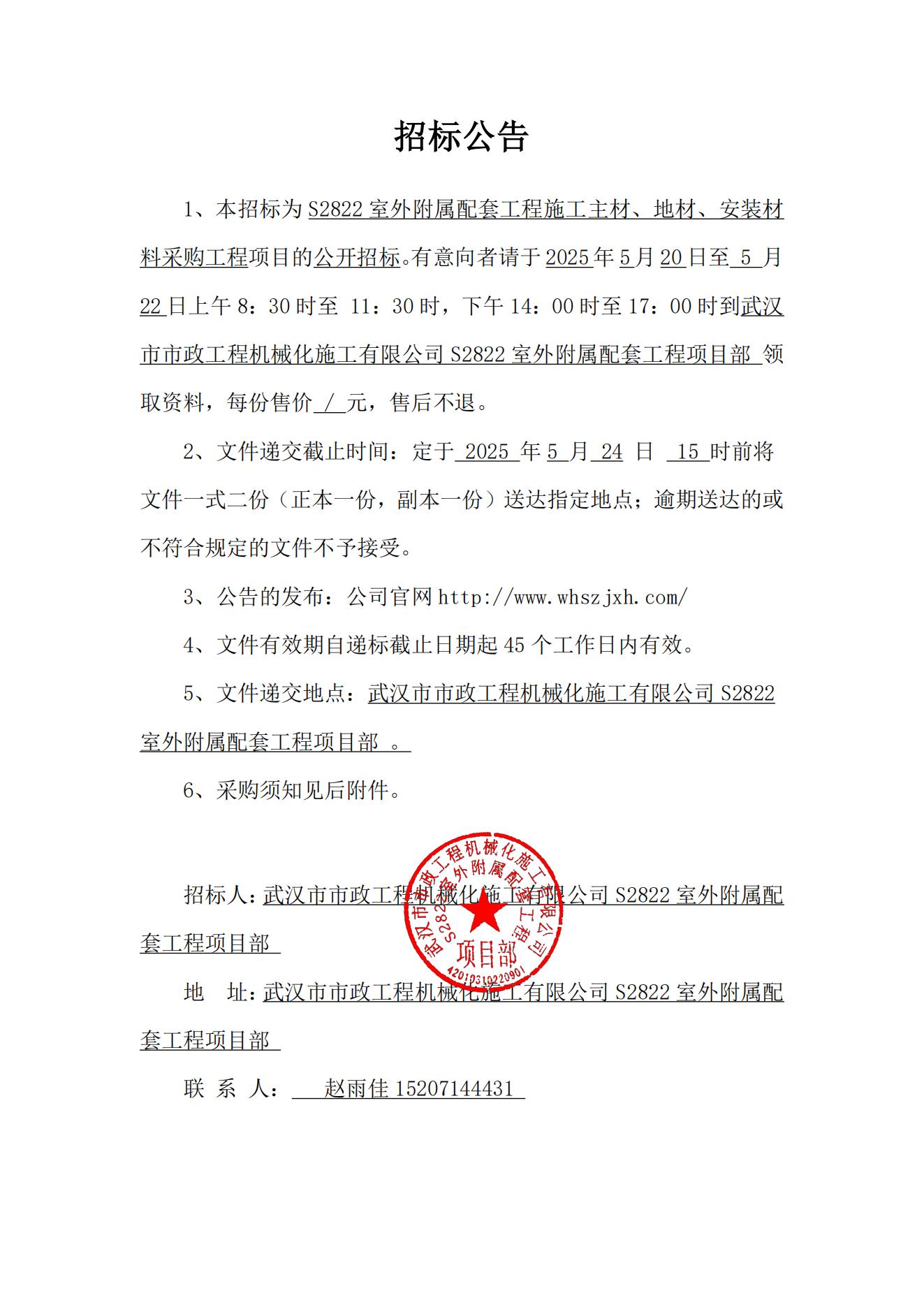S2822室外附屬配套工程施工主材、地材、安裝材料采購工程招標(biāo)公告