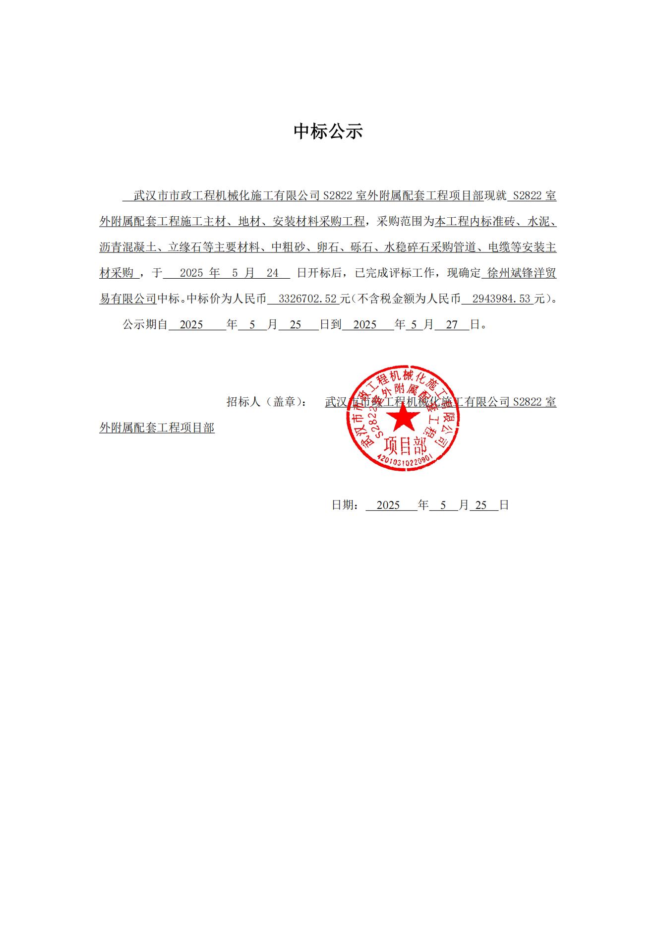 S2822室外附屬配套工程施工主材、地材、安裝材料采購工程中標(biāo)公示