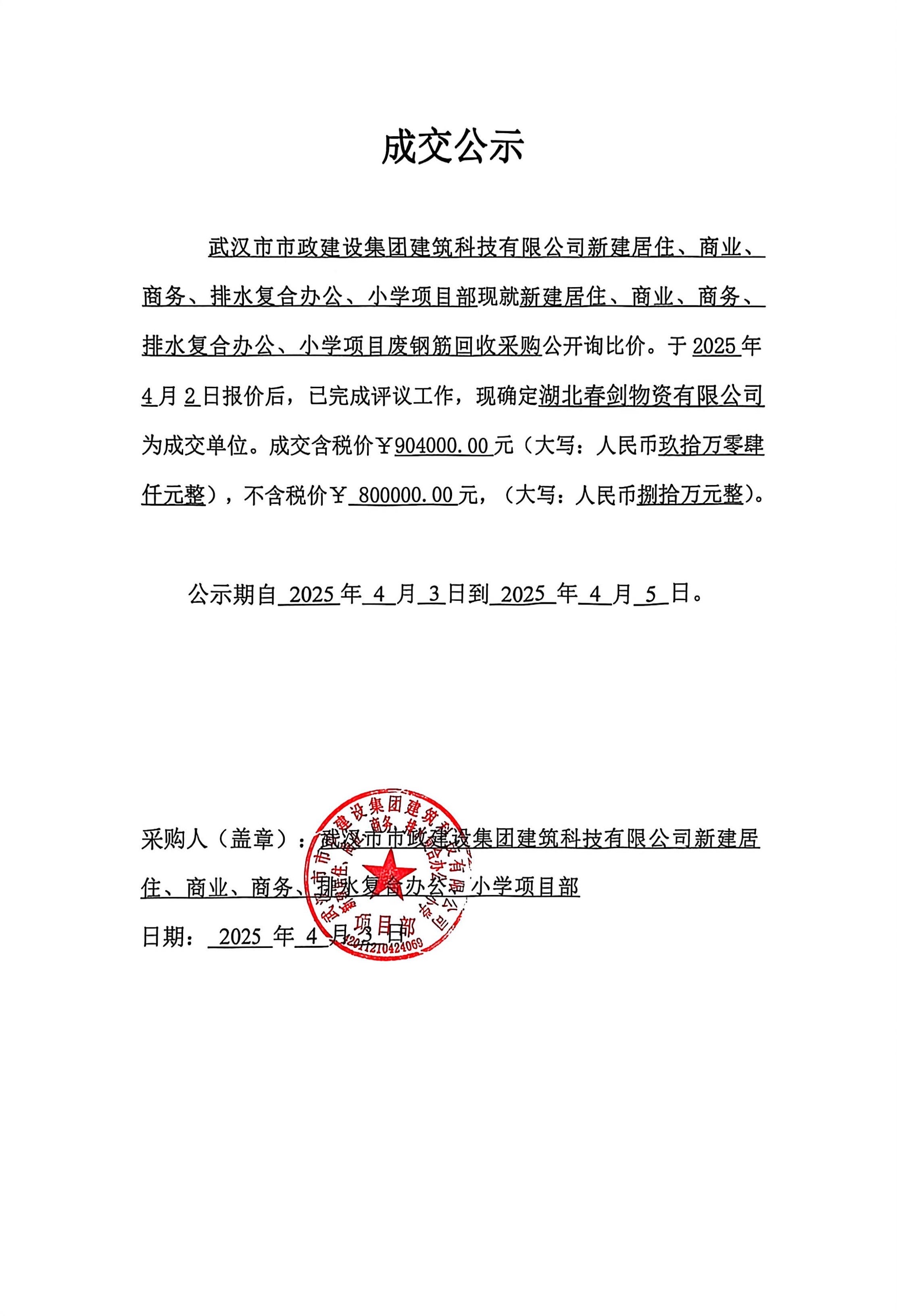 武漢市市政建設(shè)集團(tuán)建筑科技有限公司新建居住、商業(yè)、商務(wù)、排水復(fù)合辦公、小學(xué)項(xiàng)目廢鋼筋回收采購(gòu)成交公示