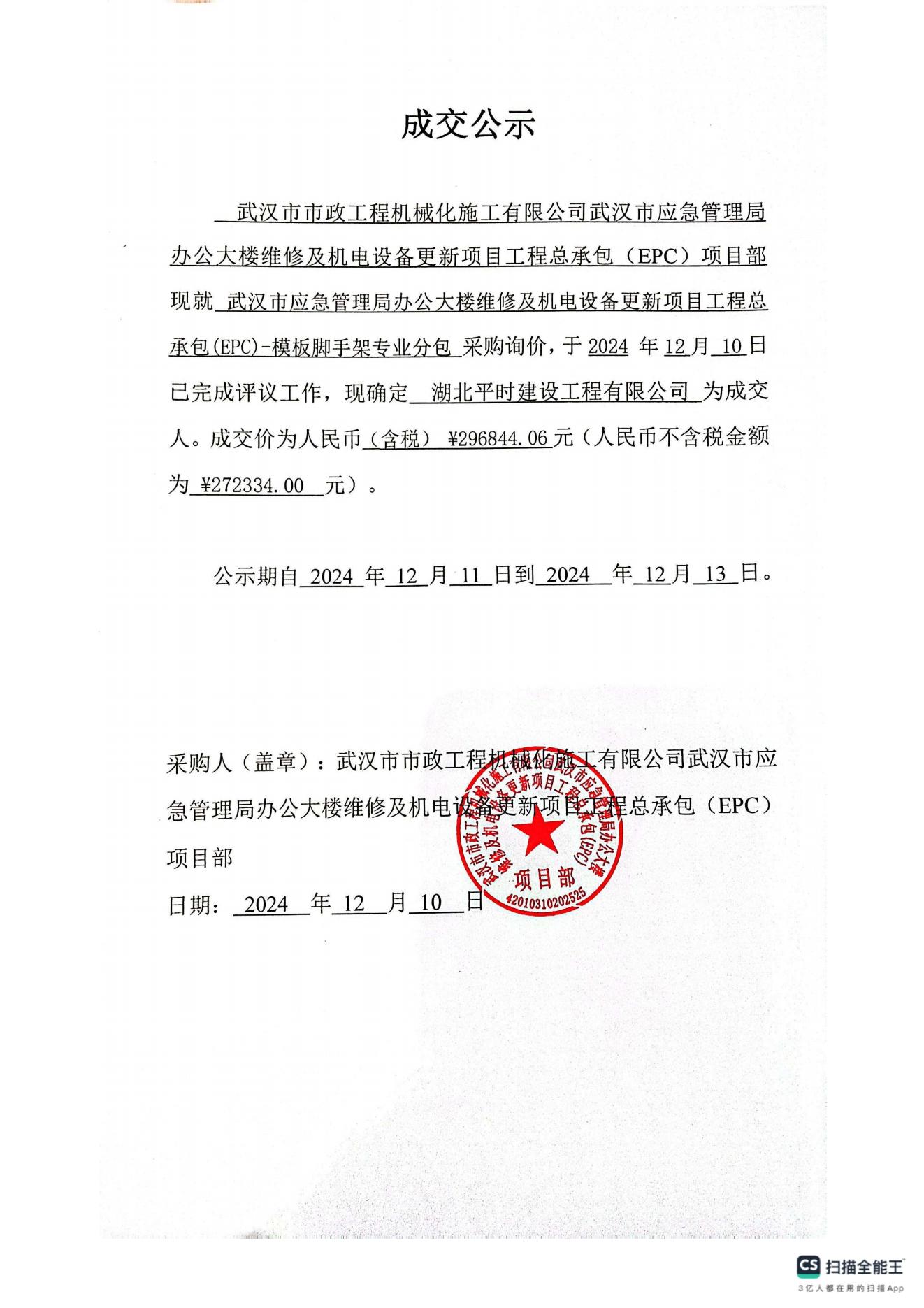 武漢市應(yīng)急管理局辦公大樓維修及機(jī)電設(shè)備更新項目工程總承包(EPC) -模板腳手架專業(yè)分包成交公示